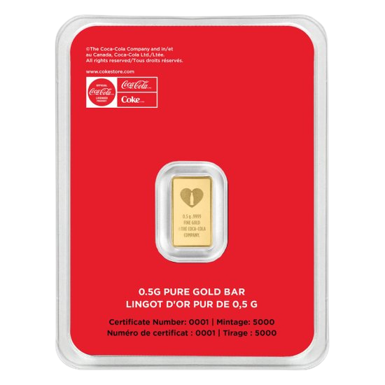 All our 0.5 gram PAMP produces Coca-Cola gold bars are brand new, with a unique serial number so you can track the gold’s quality. This product comes in a credit card-sized package.