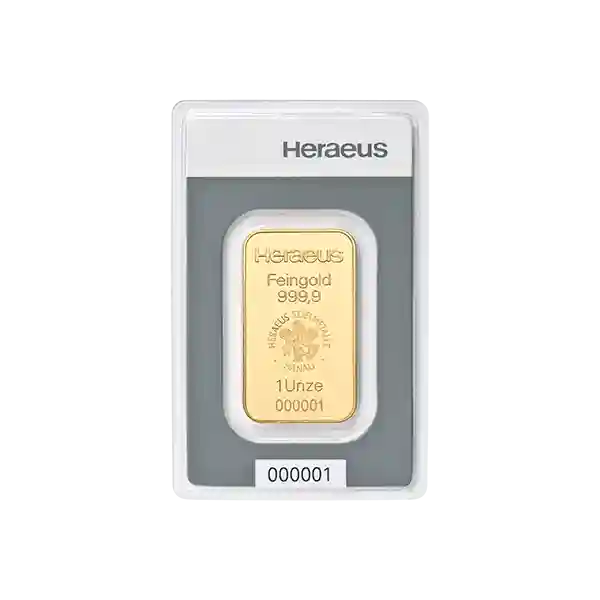 Introducing our 1 Ounce Heraeus gold bars: 24 Carat, 99.9% pure gold, LBMA (London Bullion Market Association) approved, and minted to give the product a radiant sheen and expertly finished look. The Heraeus brand name & logo are imprinted on the front alongside the bar’s weight, purity and unique serial number.