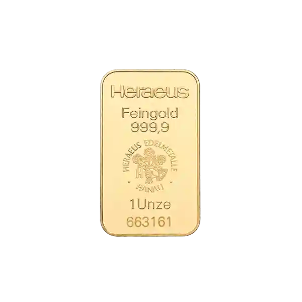 1 Ounce 24 Carat Heraeus Branded Pure Gold Bar
