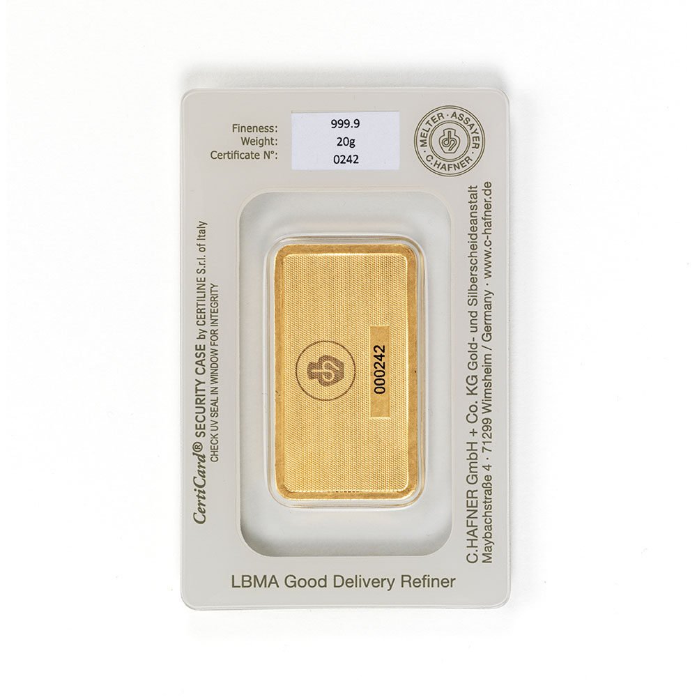 Our 20 Gram C.Hafner gold bars are a fantastic asset to invest in or collect. You’ll get some of the highest-quality gold on the market with its 24 Carat gold, 99.9% purity and C.Hafner ‘s LBMA (London Bullion Market Association) accreditation. The product design is both sleek and luxurious, with the brand name, logo, weight, and serial number imprinted on the face of the bar.