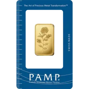 Our 20 gram PAMP Rosa Gold bars are truly unique assets, each featuring the wonderful Rosa design imprinted on the bar, as well as the brand name, logo, weight and serial number on the reversed side. You only get the best with PAMP, and these bars are all LBMA (London Bullion Market Association) approved, 24 Carat and 99.9% pure gold.