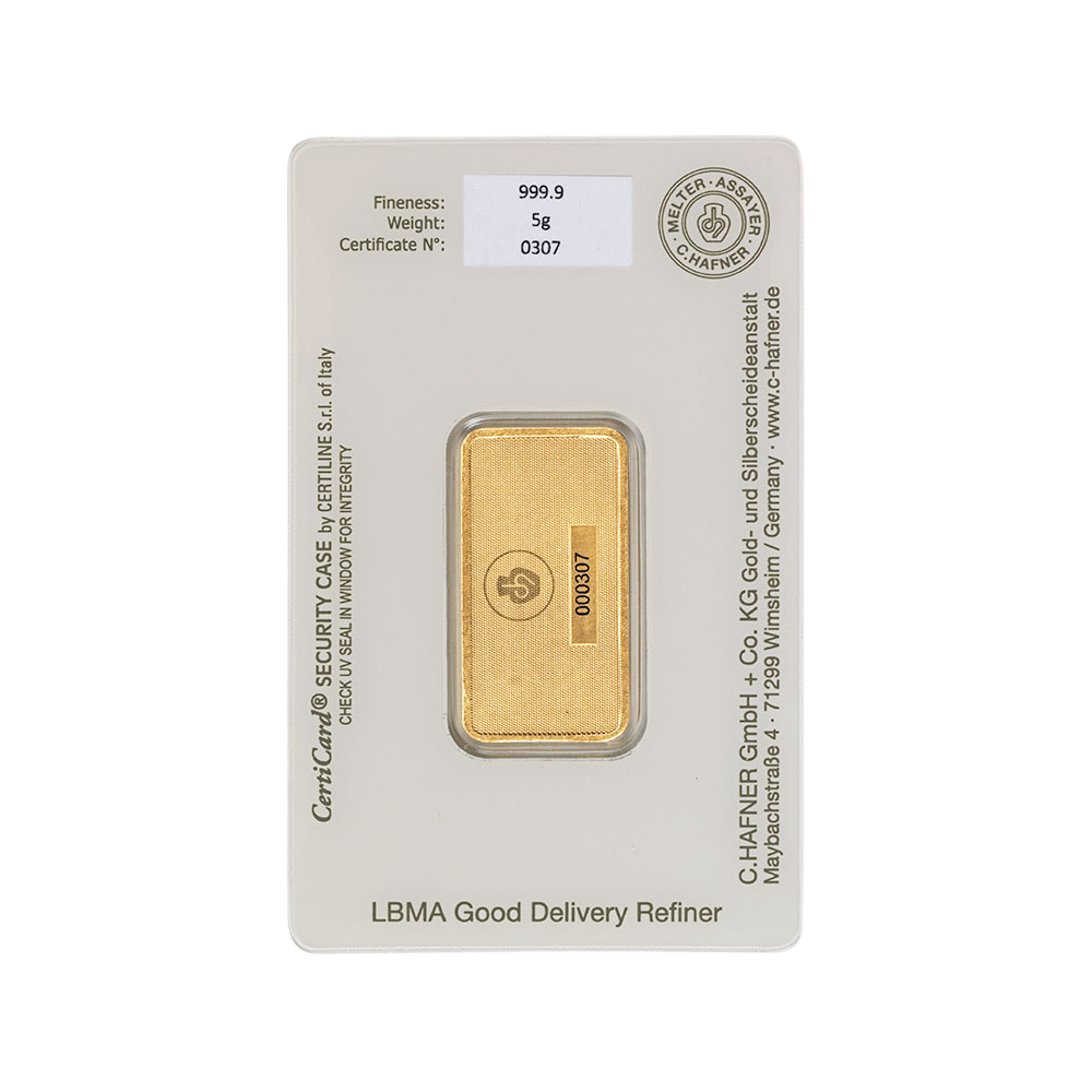Our German-Made 5 gram C.Hafner gold bars are 24 Carat, 99.99% Pure Gold and are LBMA (London Bullion Market Association) approved, making them a great choice for first-time investors and collectors, or even as a special gift.