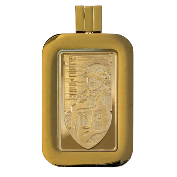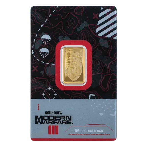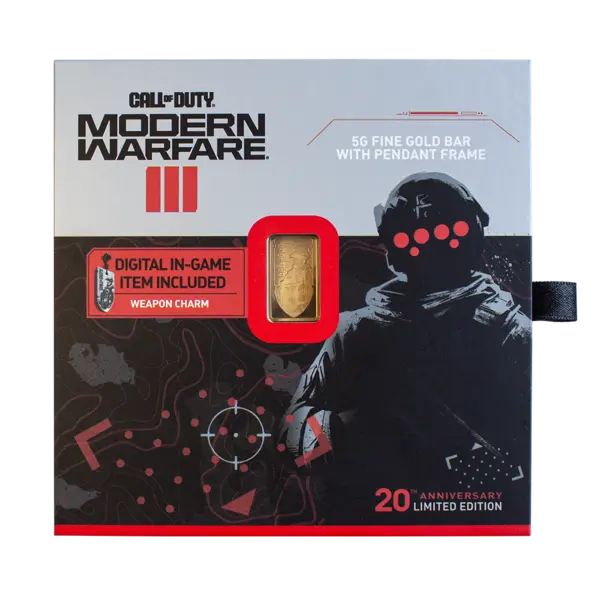 With over 100 million players worldwide, Modern Warfare® III marks the 20th year of the Call of Duty® franchise! PAMP and BullionGiant.com ARE thrilled to offer these limited issue bars with wearable pendant frames and an exclusive replica weapon charm in the MWIII game! This 5g 999.9 pure gold bar has a limited mintage of 5,000. It is individually serialized, secured within a CertiPAMP™ assay card and presented in a collectible box. And a one-time use bonus in-game weapon charm code is included on the back of the assay card.