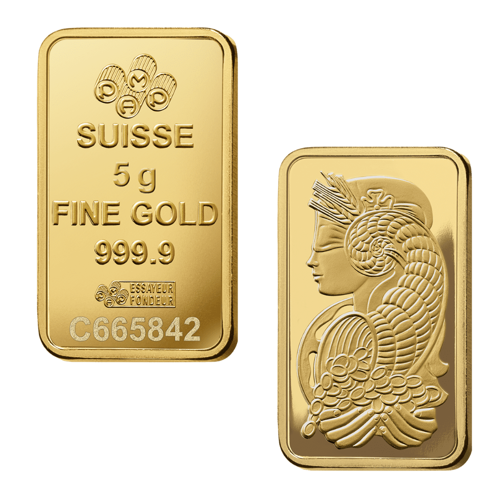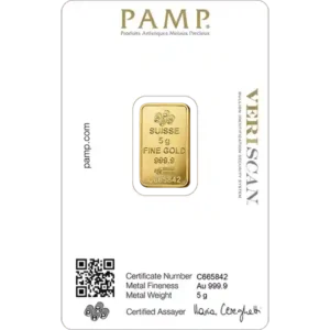 Introducing our exquisite 5 gram PAMP Lady Fortuna gold bars. Crafted with the utmost precision, these gold bars are a testament to purity and quality. Each 5 gram PAMP Lady Fortuna gold bar comprises 24k gold, ensuring a brilliant shine and lasting value. Whether you’re a seasoned investor or a discerning collector, our gold bars, weighing precisely 5 grams, are a smart choice.