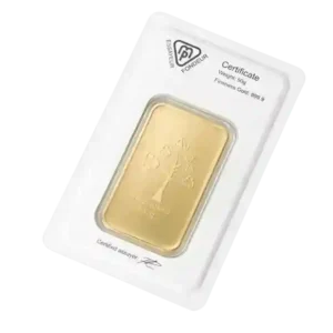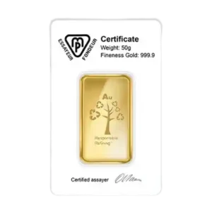 Our 50 gram gold bar is a luxury asset for both collectors and investors. This sleek gold bar is made from 24-carat pure gold, symbolising the quality and prestige that personifies this product.
