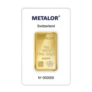 Designed by the reputable Swiss bullion brand Metalor, all of our 50 gram Metalor gold bars carry LBMA approval. Each of our 50g gold bars is stamped with a unique serial number, enabling you to trace its purity.