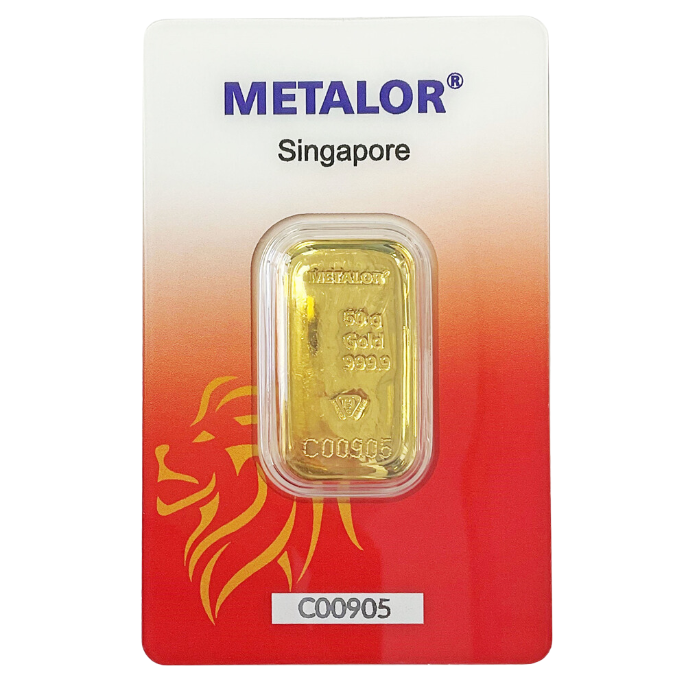Designed by the reputable Swiss bullion brand Metalor, all of our 50 gram Metalor gold bars carry LBMA approval. Each of our 50g gold bars is stamped with a unique serial number, enabling you to trace its purity.